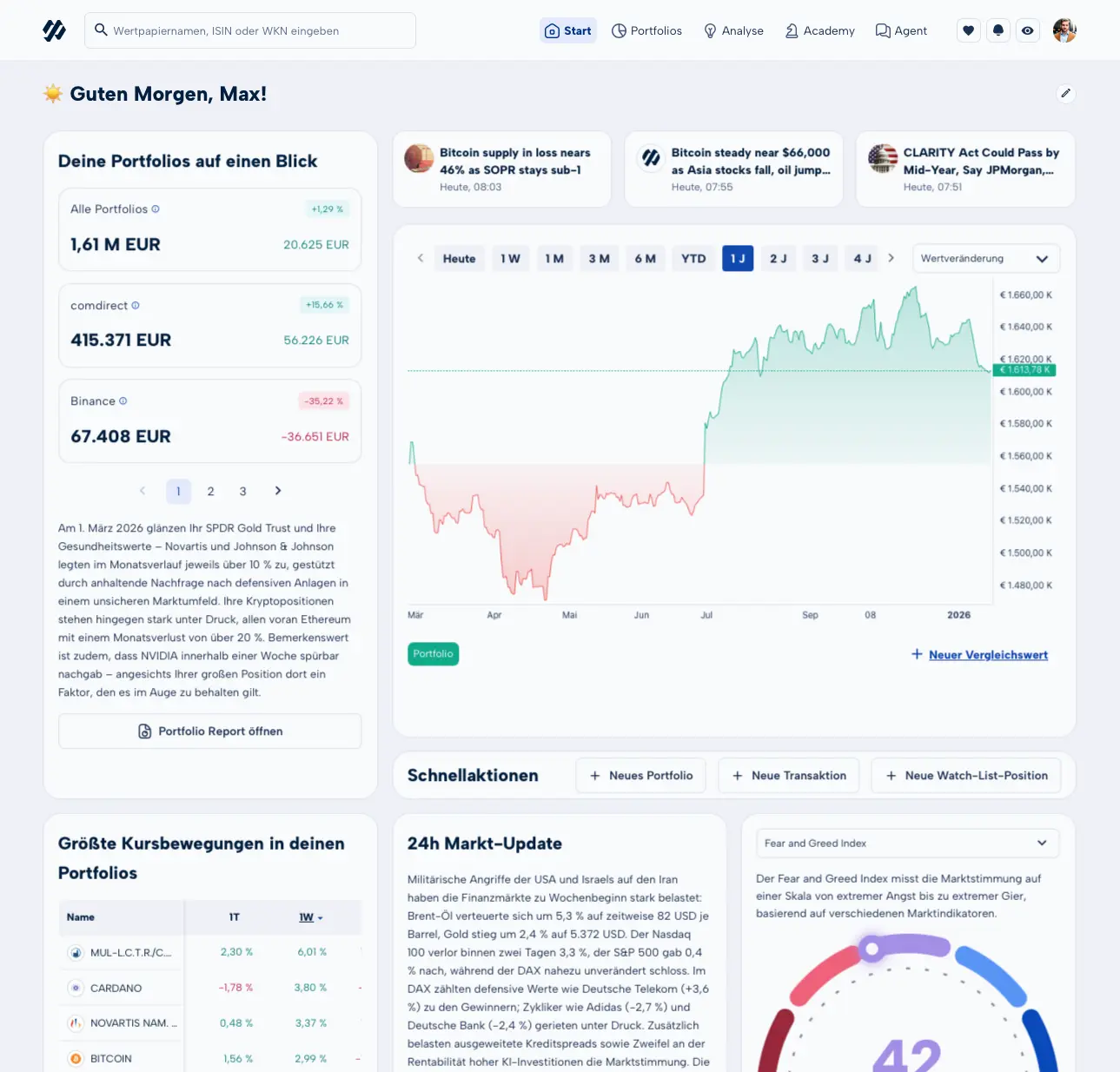 Aktien, ETFs, Krypto, Immobilien, Darlehen und mehr: alles vereint in einer übersichtlichen Ansicht. Verfolge Gewinne, Verluste und die Entwicklung deines Gesamtvermögens in Echtzeit.